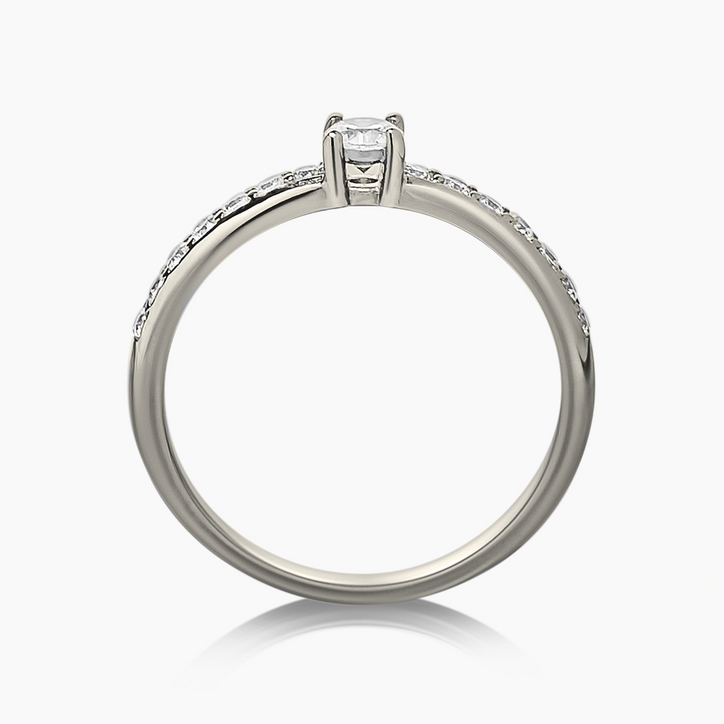 • Piedra: La combinación de piedras incluye catorce cubics zirconia talla brillante de 1.5mm. de diámetro para el pavé y, en el centro, un diamante de laboratorio talla brillante que puede ser de 3.5mm, 4mm, 4.5mm o 5mm de diámetro.
