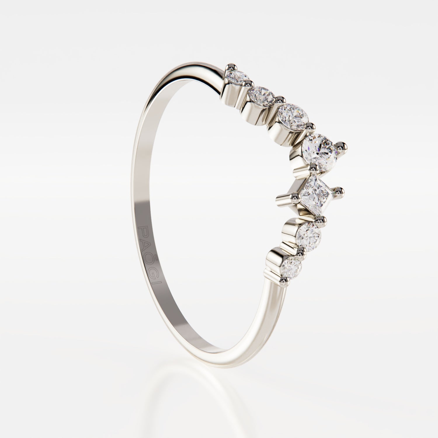 • Piedras: Cuenta con 7 diamantes naturales en total: uno de talla cuadrada de 2x2mm y seis de talla brillante de 1.5mm, 1.8mm, 2mm y 2.5mm de diámetro